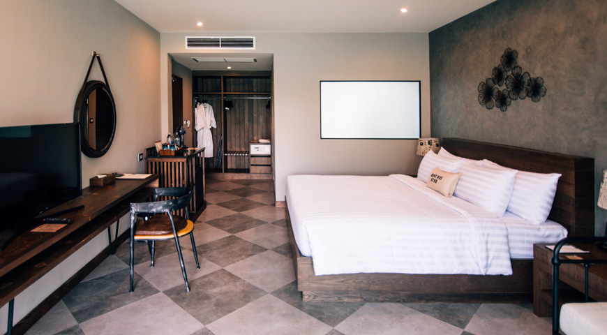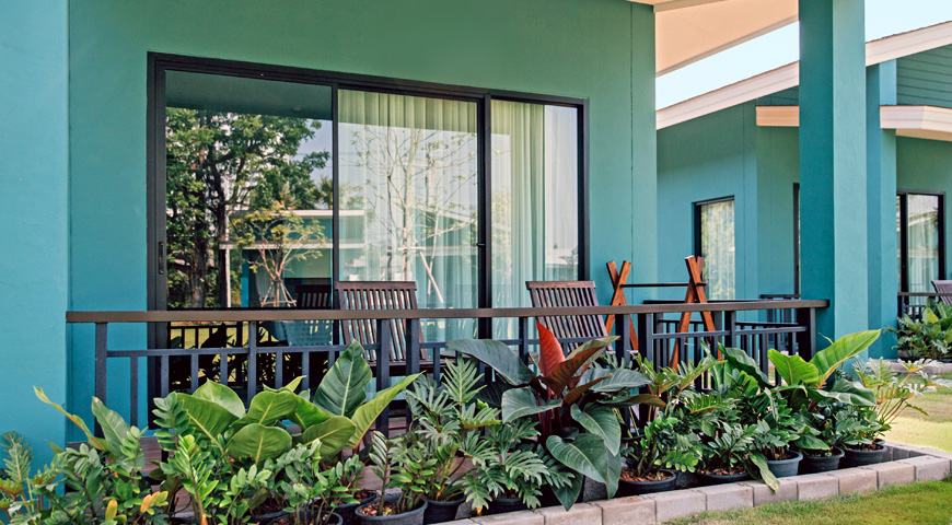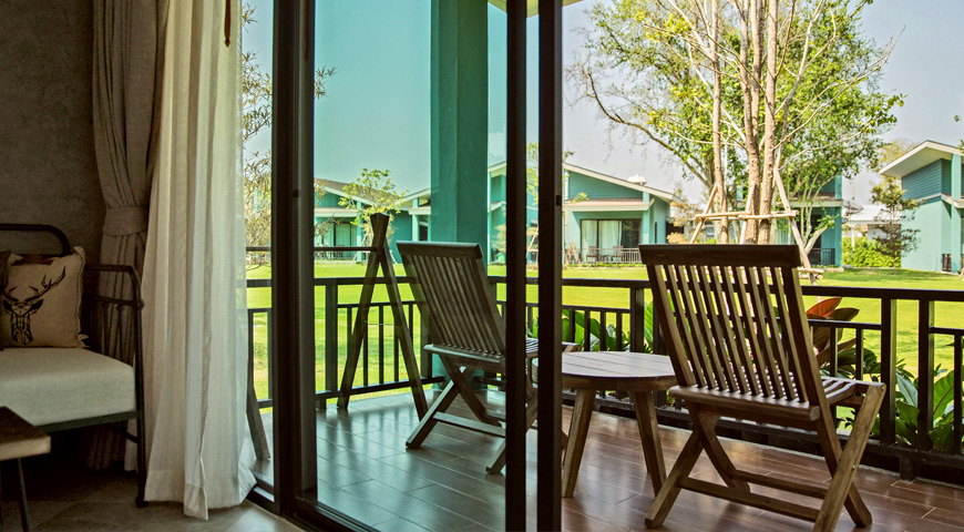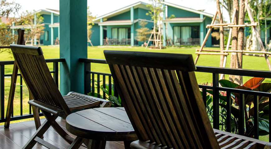 Our Deluxe Garden Villa faces onto a large lush area carpeted in grass. Relax in the comfort of your own room or chill outside on the communal green. The grass area is so large, you could have a game of football!