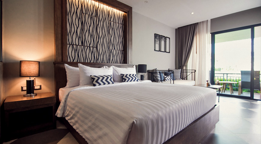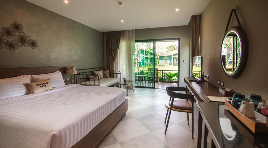 Our Deluxe Garden Villa faces onto a large lush area carpeted in grass.Relax in the comfort of your own room or chill outside on the communal green. The grass area is so large, you could have a game of football!